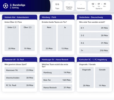 Du hast bis zum Anpfiff des jeweiligen Spieltags die Chance deine Tipps abzugeben, bzw zu bearbeiten. Alle Fragen, die dir gestellt werden, sind Multiple-Choice-Fragen, bei denen du jeweils eine Antwort auswählen musst.