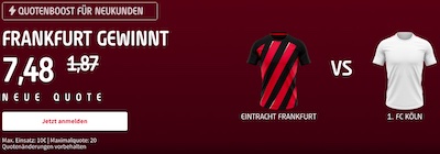 Schon im obigen Quotenvergleich siehst du, dass die Adler als Favorit in das Duell mit den Geißböcken gehen. Bundesliga Wettanbieter Tipico setzt dem ganzen aber die Krone auf. Der lizenzierte Wettanbieter steigert die Quote auf einen Sieg von Frankfurt um satte 300%! Allerdings können nur deutsche Neukunden von dieser Vervierfachung profitieren. Diese müssen sich im Zeitraum von 02.09 – 12:00 Uhr bis 03.09 – 15:30 Uhr bei Tipico registrieren, um dieses Angebot nutzen zu können. Besonders wichtig ist, dass du einen unserer Links nutzt, da diese Aktion auf der Startseite nicht sichtbar ist.