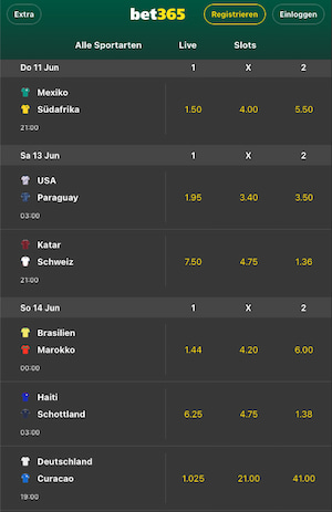 Für bestehende Kunden gibt es Top-Angebote wie die bet365 vorzeitige Auszahlung bei 2-Tore-Führung. Diese Promotion sollte normalerweise kurz vor WM-Start auch auf die WM ausgeweitet werden. Einfach dranbleiben!